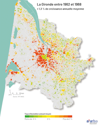 Cependant, si la population girondine a crû de manière importante, un quart des communes ont moins d’habitants en 2023 qu’en 1962, à commencer par Bordeaux ou Arcachon. Le Saint-Émilionnais, un certain nombre de communes de Haute-Gironde, du Médoc intérieur ou situées dans les confins du département sont restées à l’écart de la croissance. Le développement est en revanche très marqué autour de la métropole bordelaise, autour du Bassin d’Arcachon (hors Arcachon) et le long du littoral et dans les communes situées de part et d’autre de l’A10.