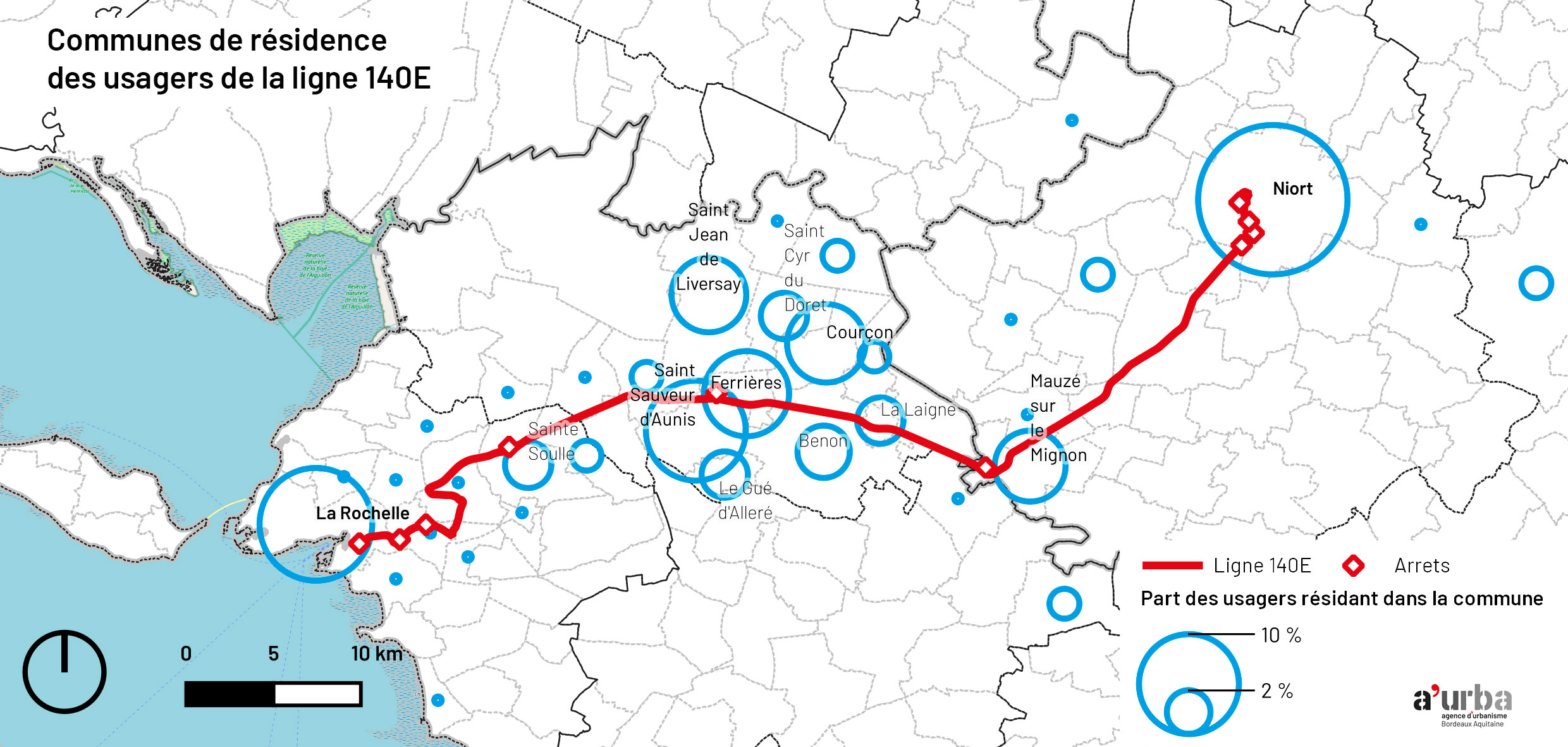 - la reprise d’une part importante des usages préexistants de la ligne 140 « historique » entre La Rochelle et le pôle d’échanges multimodal de Ferrières, y compris pour des habitants des communes alentours qui s’y rabattent ;