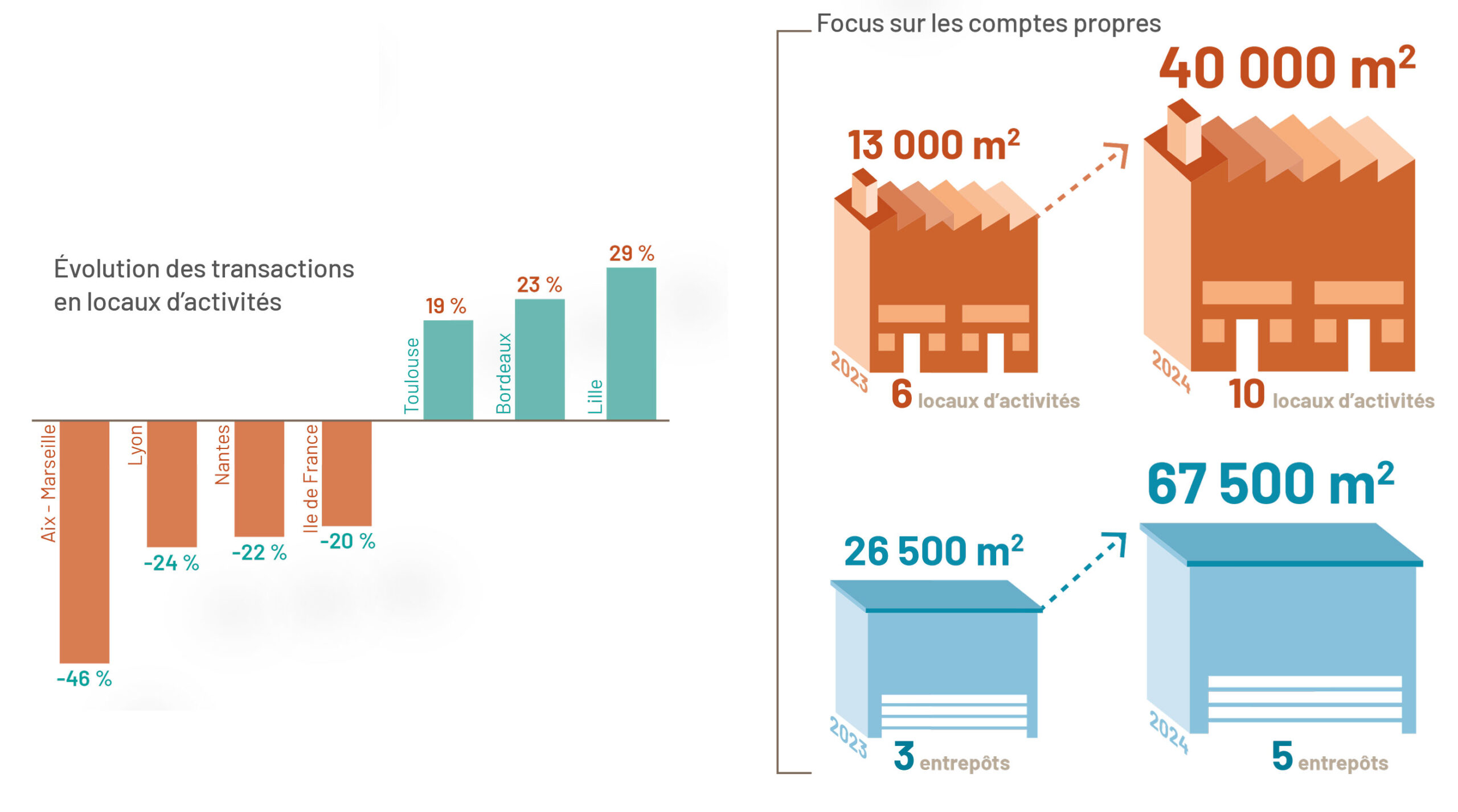 La bonne performance affichée par la place bordelaise tient essentiellement au rebond des comptes propres comptabilisés cette année. Ils pèsent pour 27 % de la demande placée totale contre 11 % en 2023. La dizaine d’opérations comptabilisées reflète la diversité des secteurs d’activités productifs implantés sur le territoire : maroquinerie de luxe, aéronautique, BTP ou encore filière viticole.
