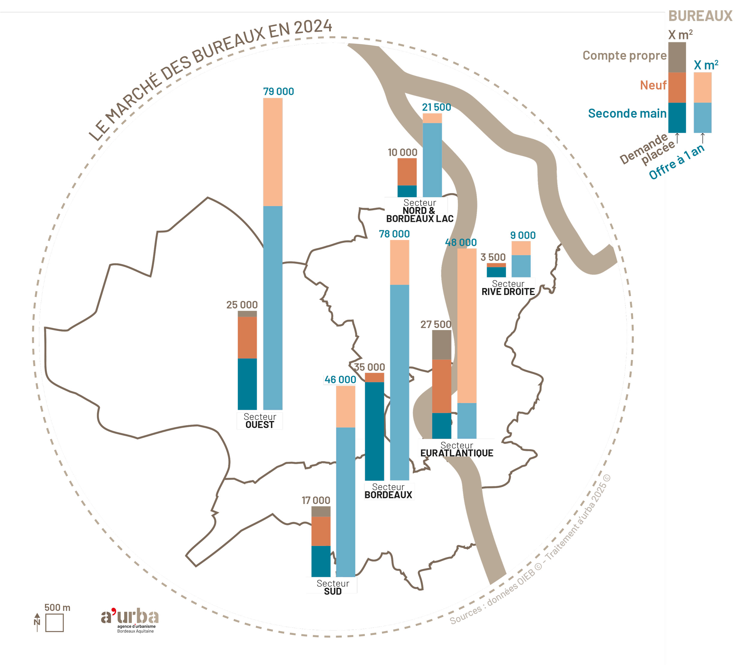 Les indicateurs d’observation permettent de positionner les marchés en immobilier par rapport aux autres territoires, de spatialiser les dynamiques locales, mais également d’observer dans le temps les trajectoires empruntées. À l’échelle locale, les données sont fournies par l’Observatoire de l’immobilier d’entreprise Bordeaux Métropole (OIEB) et analysées par l’a-urba.