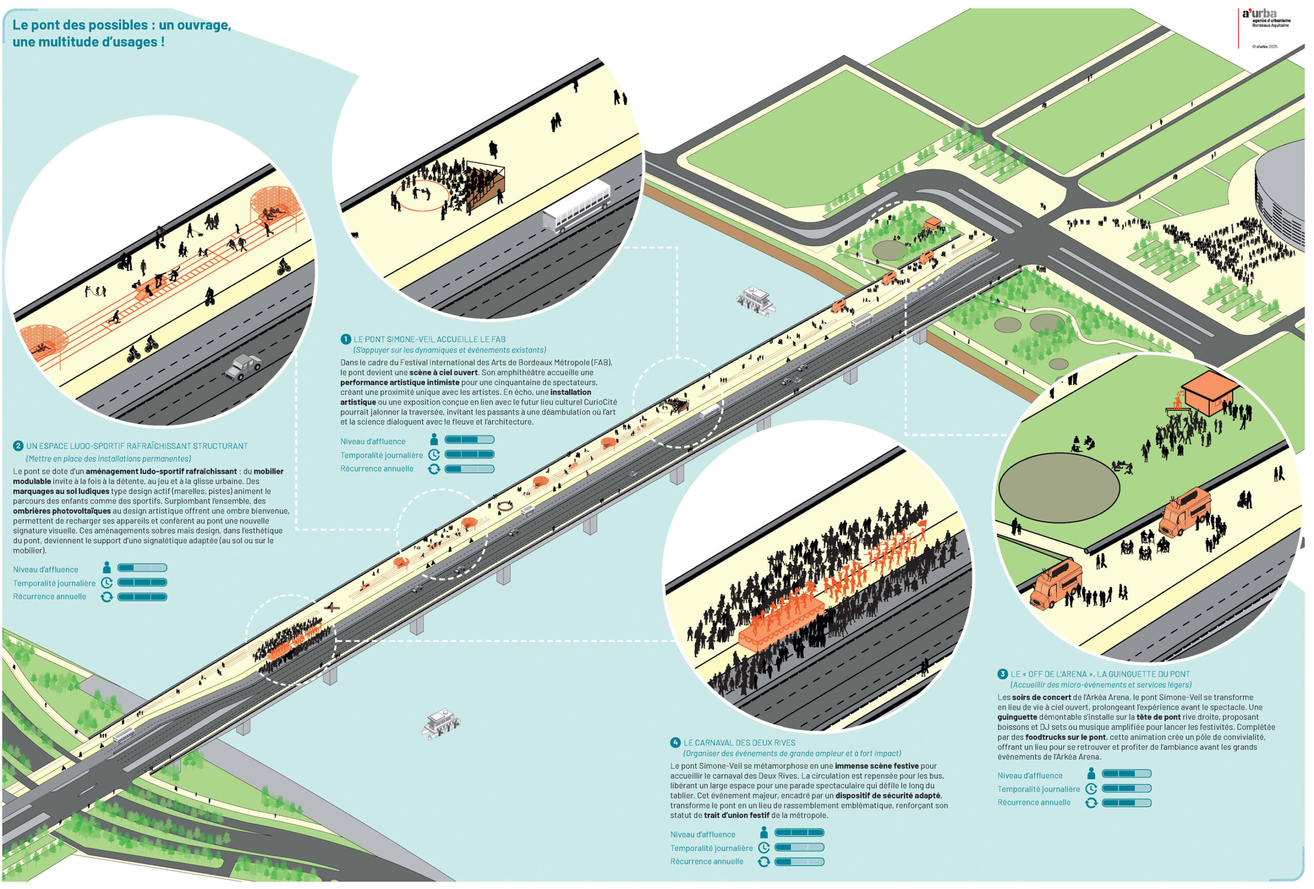 En écho aux quartiers en transformation de Saint-Jean Belcier, Bègles-Garonne, quais de Floirac et Garonne Eiffel, le pont devient un trait d’union pour les mobilités douces, mais aussi un laboratoire d’usages où s’inventent de nouvelles formes de convivialité urbaine.