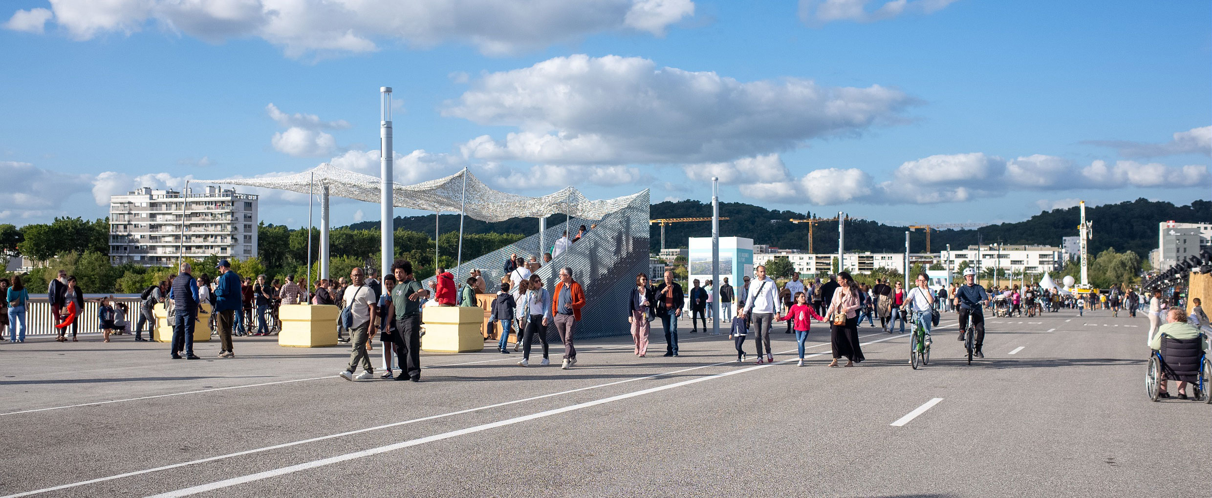 L’étude « Le pont Simone-Veil, quels usages ? » observe les appropriations émergentes : traversées quotidiennes à vélo, balades, pauses contemplatives, événements culturels ou sportifs… Elle interroge les modalités d’accompagnement et de gestion d’un espace public inédit, à la croisée des mobilités et des loisirs, des pratiques du quotidien ou plus exceptionnelles.