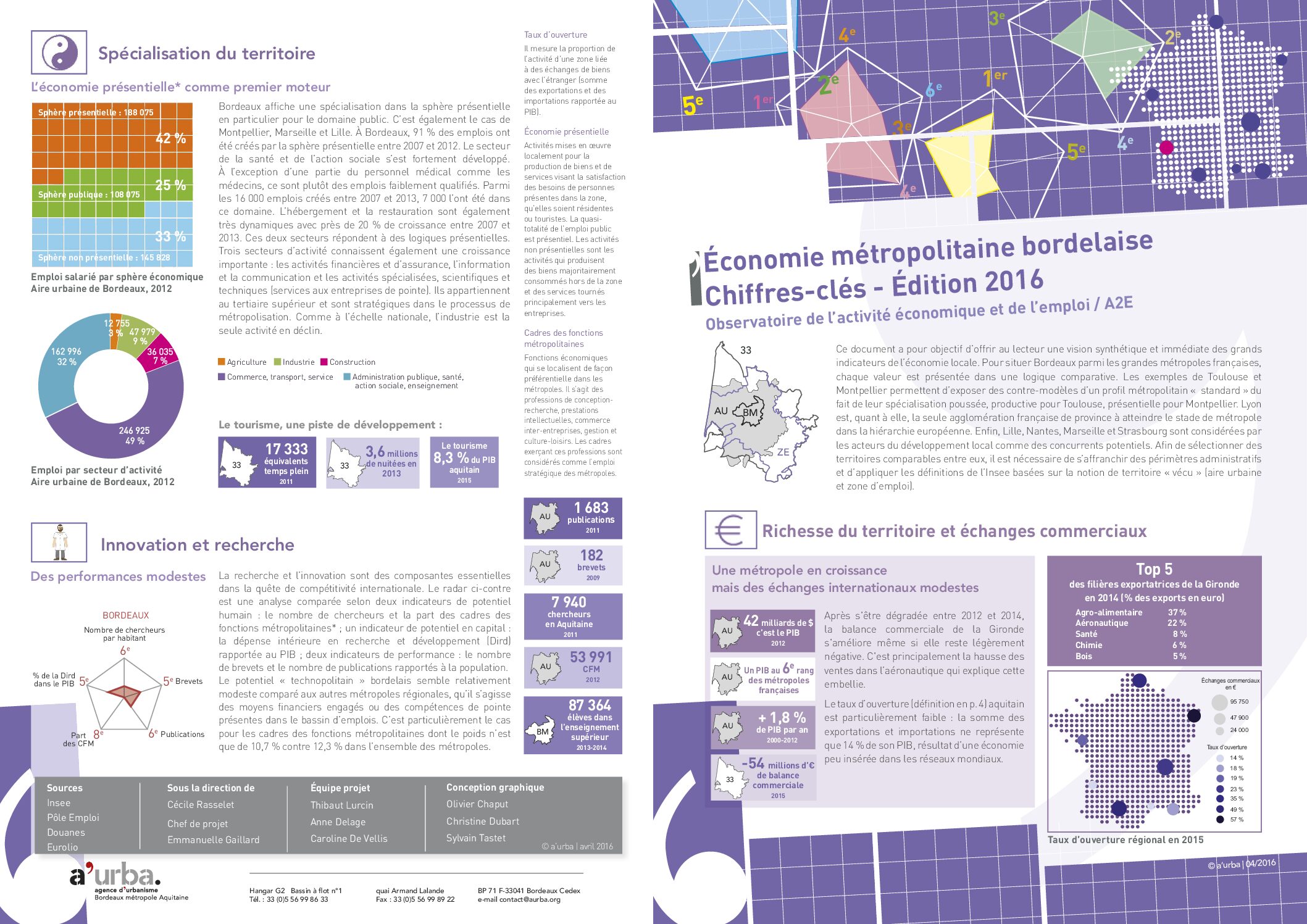 Chiffres-clés – Édition 2016 Ce document de l’Observatoire de l’activité économique et de l’emploi (A2E) a pour objectif d’offrir au lecteur une vision synthétique et immédiate des grands indicateurs de l’économie locale. Pour situer Bordeaux parmi les grandes métropoles françaises, chaque valeur est présentée dans une logique comparative. Les exemples de Toulouse et Montpellier permettent […]